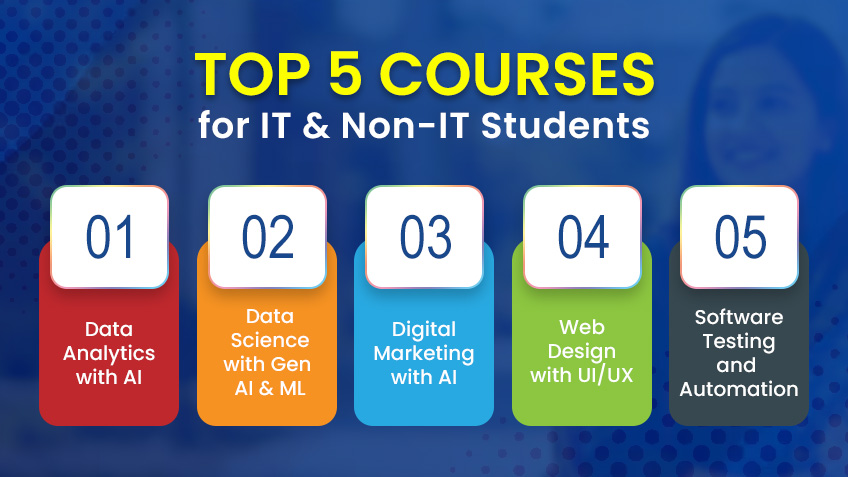 What are the top courses for IT and non-IT students? It is data science with Gen AI & ML, data analytics, web design with UI/UX, and digital marketing with AI. But out of these, which one is the best IT course for you? Let’s understand each field and pick the best for a high-growth career!